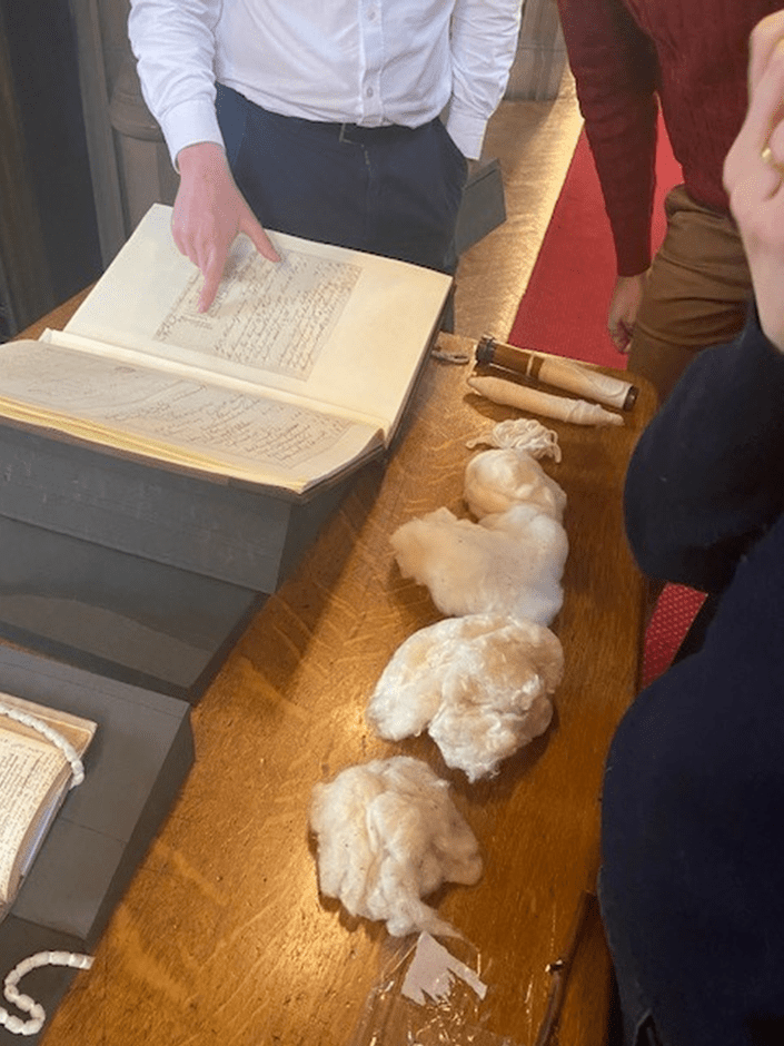 On the 27th October 2023, I joined with the public engagement team at the John Rylands Library, Harry Eyre of the Ahmed Iqbal Ullah RACE Centre, and Matthew Stallard of Global Threads, to host a “Collections Encounter” that offered visitors a closer look at items relating to the Founders and Funders exhibition. These included McConnel and Kennedy’s order book, samples of raw and worked cotton from the Science and Industry Museum, and archive materials from the RACE Centre.