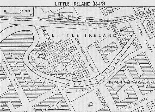 Conditions in Little Ireland and other predominantly Irish settlement areas were notoriously awful, as many contemporary observers like Friedrich Engels, who lived in the city in the 1840s with his Irish-descended partner Mary Burns, remarked. Engels’ usage of the term ‘race’ indicates how Irish people were socially othered in 19th century Britain and imagined to be a separate race to the English.