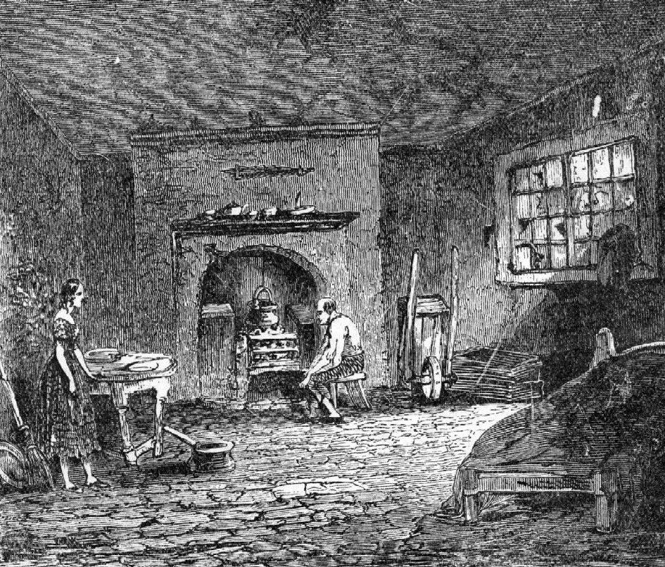 The room comprises two cells, which he estimates as not exceeding three and a half yards square, and beneath his feet he notes the complete absence of pavement. Shavings lie piled in two corners, undoubtedly where the labourer who inhabits this particularly sad dwelling and his children sleep, in between the long hours of the working day. The sight of it leaves him wondering if perhaps “misery” is not a strong enough word.