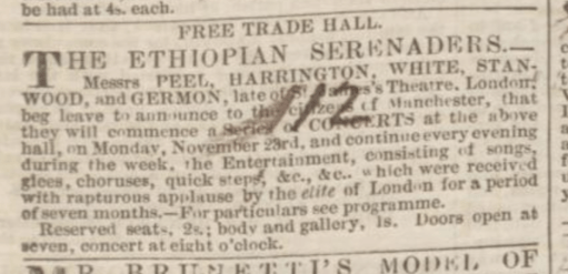 Shortly before Douglass’s visit, one popular act, the Virginia Minstrels, performed at the Manchester Athenaeum (now part of Manchester Art Gallery) while another group known as the Ethiopian Serenaders performed for six consecutive nights from 24th-29th November on the very stage at the Free Trade Hall from which Douglass spoke so eloquently and powerfully against the violence and injustice of racial slavery mere weeks before.