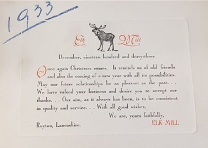 Employees received holiday cards from the management and were thanked for their work ethic and commitment. Workers were also offered a variety of benefits as part of their employment. Elk Mill had a nursery which could accommodate 74 children aged from aged 6 months to 5 years, and it also provided laundry facilities. Employees also received a share of profits each year and there were bonuses for long service. Labour shortages were a constant problem for the Lancashire textiles industry during this period and these benefits were designed to help to attract and maintain loyalty in employees.