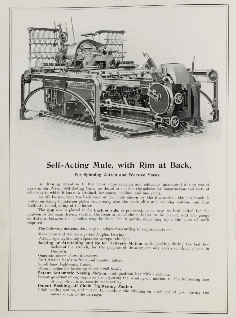“Messrs. Platt Brothers and Company, Oldham, have secured the contract for the equipment of the new Elk Mill now in course of creation at Royton for the Shiloh Mills, Limited, Royton. The order is for 110,000 mule spindles and the necessary preparatory machinery.”