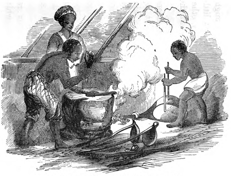They were in some respects not unlike the stoves here in gentlemen’s kitchens; and were covered over with leather; and in the middle of that leather a stick was fixed, and a person stood up, and worked it, in the same manner as is done to pump water out of a cask with a hand pump.I believe it was gold he worked, for it was of a lovely bright yellow colour, and was worn by the women on their wrists and ancles.”